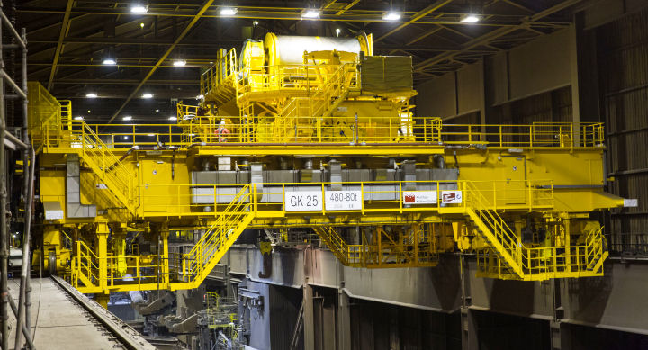 De Warmbandwalserij is een enorme fabriek midden op het terrein van Tata Steel. Vuistdikke plakken staal van een paar meter komen hier binnen om te worden omgevormd tot opgerolde rollen staal van tientallen meters lang. Hiervoor wordt het staal verwarmd, gewalst en uiteindelijk gewikkeld op een enorme haspel. En binnenkort wordt de oude haspel vervangen door een nieuwe.