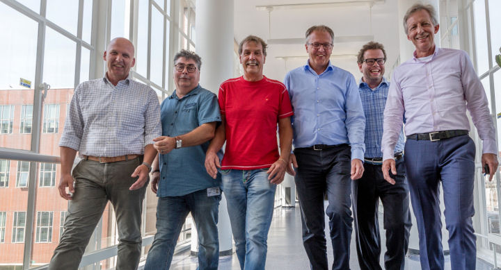 Op de foto v.l.n.r. Erik Langeweg, Bestuurder VHP, Tata Steel, Peter Böeseken, Bestuurder CNV Vakmensen, Aad in ’t Veld, Bestuurder FNV Metaal, Guido Bockting, Director Human Resources, Gertjan Tommel, Belangenbehartiger De Unie, Huub Rijk, Manager Industrial Relations