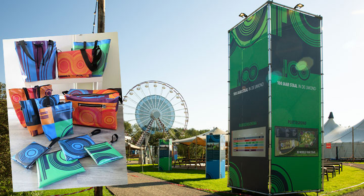 Voor wie een bijzonder cadeau zoekt voor onder de kerstboom is er nu een collectie tassen en etuis verkrijgbaar gemaakt van banners met de kleurrijke jubileumlogo’s van het eeuwfeest van Tata Steel.