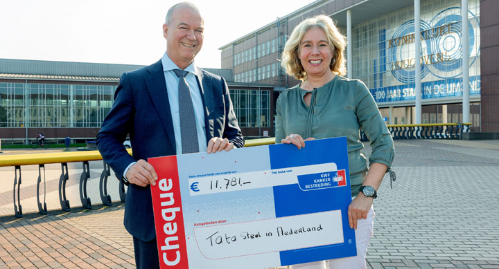 De medewerkers van Tata Steel in Nederland hebben 11.781 euro ingezameld voor het KWF. Hans van den Berg, directeur Tata Steel in IJmuiden, overhandigde de cheque aan Willemijn van den Berg van het KWF.