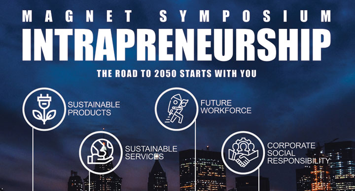 Het Magneet Symposium is een jaarlijks terugkerend evenement wat dit jaar plaats zal vinden op 5 april 2019. Het thema van dit jaar is: Intrapreneurship – the road to 2050 starts with you. “Intrapreneurship” staat voor personen binnen een organisatie die zich ondernemend gedragen. Het symposium heeft daarom een sterke focus op het ontwikkelen en implementeren van nieuwe ideeën binnen bestaande organisaties. De focus ligt hierbij op de perspectieven Future Workforce, Sustainable Products, Sustainable Services en Corporate Social Responsibility.